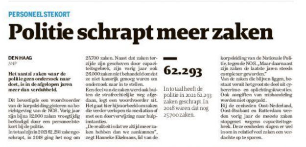 Hoe triest is dit ?! Er zou gekeken kunnen worden naar vormen van Publiek Private samenwerking met bijvoorbeeld Particuliere Recherchebureaus. In deze sector zijn veel ex politiemensen met een ruime mate van opsporingservaring actief. Het grote aantal te schrappen zaken zou daarmee aanzienlijk verminderd kunnen worden. L1  Vandaag radio 25-07-2022 17-19u JohnV-detectives in uitzending Vandaag…