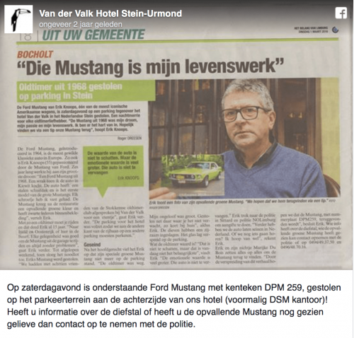 Eind 2015 werd privedetective John Vullers door een Duitse klant benaderd om zijn in Aken gestolen Mustang op te sporen. Na maanden en maanden van intensief onderzoek kwam John Vullers medio 2016 de Mustang op het spoor. Wat volgde was een spannende tijd van onderhandelen met ‘gasten’ die de auto in hun bezit hadden. Deze Mustang was veel meer dan alleen maar een auto voor de benadeelde. Klik op de link onderstaand en kijk naar de uitzending van Autombil en de positieve afloop.